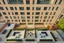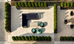The second-floor terrace is composed of a duotone checkerboard of distinctive pavers that correspond to the spaces created in the courtyard. Sustainably harvested tropical hardwood decking, pavers, and evergreen boxwoods delineate the courtyards on both floors. The design uses the same sustainable hardwood for vertical lattices to create semi-private spaces, and dense evergreen boxwoods in sleek raised, planters further define the fully furnished open-air rooms. The semi-private rooms create a sense of intimacy while still preserving the inclusivity of the accessible open rooftop and providing opportunities for socialization and recreational uses. The seventh-floor terrace includes seating areas below trellises, community gardens, ping pong tables, hammocks, BBQ grills, and communal dining areas with granite countertops. The design uses vertical vegetated screens to conceal the rooftop mechanical equipment and varying methods to seamlessly connect the two rooftop elevations into one cohesive open space.